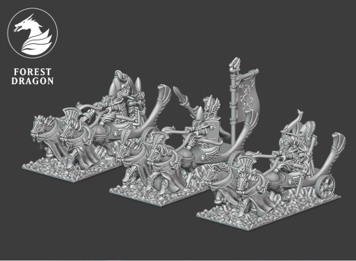 Noble Elf Chariots, Noble Elf Army, Warmaster 10 mm – 4 modele rydwanów (w tym 2 ze sztandarem), plus 4 podstawki.