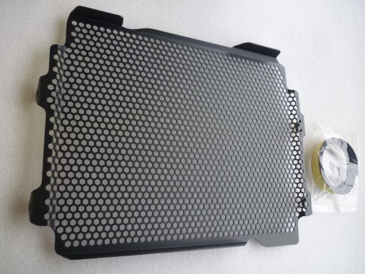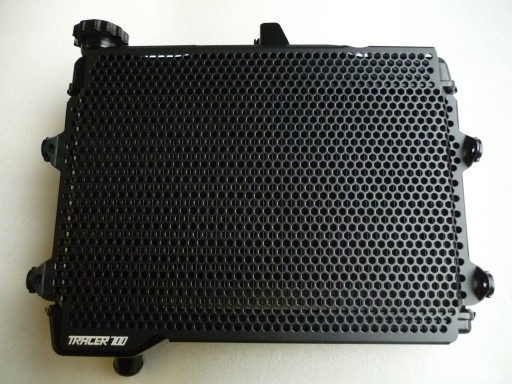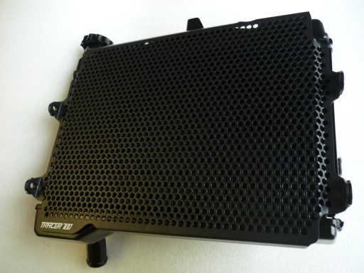Oferuję na sprzedaż bardzo ładną,dużą,nową osłonę chłodnicy wykonaną z tłoczonego aluminium metodą CNC,waga tylko 198g.Osłona jest bardzo estetycznie i ładnie wykonana,stanowi jeden lity trwały element.Osłona jest idealnie wyprofilowana do kształtu chłodnicy dzięki czemu dobrze przylega i nie ma problemu z montażem bocznych oryginalnych osłon chłodnicy.Pasuje idealnie do wersji przed jak i poliftowej Tracer 700..Z racji dużego rozmiaru chroni całą powierzchnię chłodnicy,na trzech zdjęciach prezentujemy osłonę przymierzoną do nowej chłodnicy (Chłodnice do MT 07 srebrne jak i czarne również posiadamy).