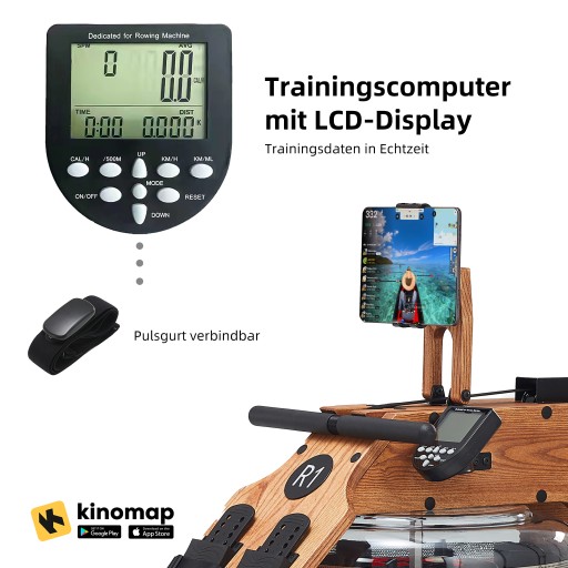 JASPORT R1 | Wioślarz wodny do domu z drewna litego (jesion) | Maszyna do wiosłowania z komputerem treningowym (kompatybilny z Kinomap) i uchwytem na tablet