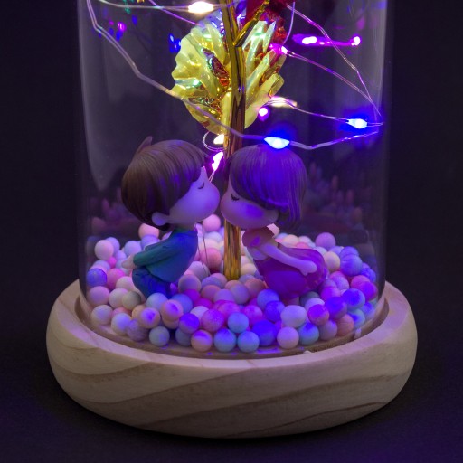 Czerwona, przechodząca w złotą sztuczna róża, z figurkami całującej się pary i kolorowymi kuleczkami w kopule szklanej, z kolorowym oświetleniem LED.
