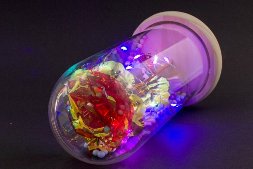 Ta precyzyjnie zrobiona róża, symbol miłości, została umieszczona w szklanej, pięknej kopule, przez którą widać cały czas jej piękno, nawet po ciemku, gdyż rozświetla ją 20 światełek LED , którymi jest oplatana.