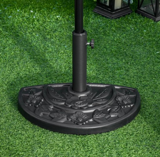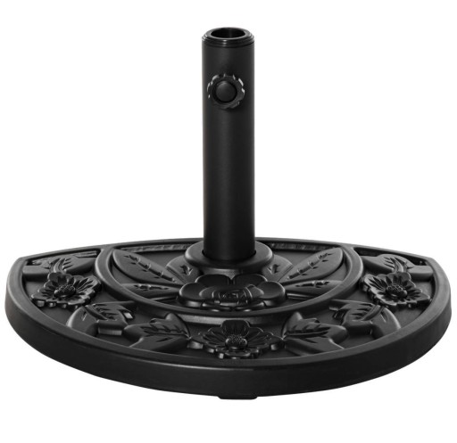 Nadaj swoim meblom ogrodowym elegancki akcent za pomocą tego półokrągłego stojaka na parasol. Wykonany z mieszanki HDPE, cementu i metalu, o wadze 9 kg, jest odporny na silne deszcze i wiatr, nadaje się więc do użytku przez cały rok. W uniwersalnej czarnej tonacji ma grawerowany delikatny i piękny wzór kwiatowy na górnej części oraz zabezpieczenie śrubą do idealnego umocowania masztu parasola.