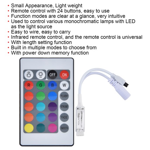 2. Łatwy w użyciu: 24-klawiszowy, kolorowy kontroler RGB na podczerwień można łatwo podłączyć, przenosić i używać.