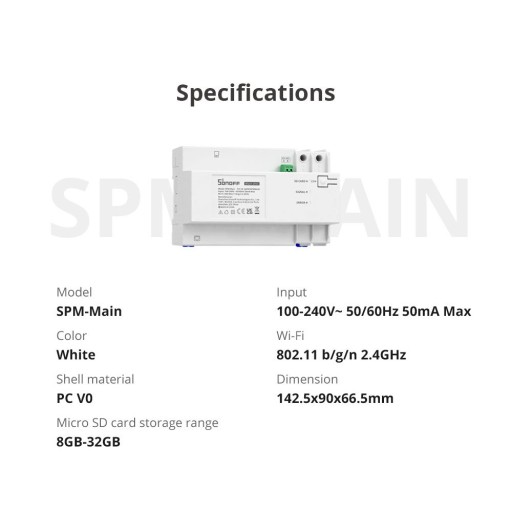 Producent Sonoff Model SPM-Main Kolor Biały Wejście 100-240 V ~50/60 Hz 50 mA maks. Wi-Fi 802.11 b/g/n 2,4 GHz Materiał PC V0 Wymiary 142,5 x 90 x 66,5 mm Kompatybilne karty SD 8-32 GB, SDHC