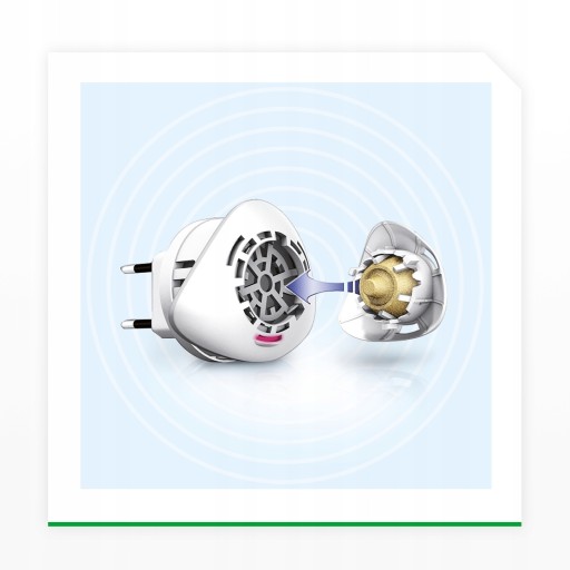 - Czas działania produktu. 1 wkład działa przez 10 dni (używany 24 godziny na dobę). Kiedy po 10 dniach wskaźnik zużycia wkładu wyschnie, należy wymienić wkład na nowy. W celu wyłączenia produktu, po prostu wyciągnij go z kontaktu. Produkt podłączony do prądu należy chronić przed ingerencją dzieci i osób szczególnej troski. Do użytku w pomieszczeniach, w których przebywają dzieci. 1 urządzenie chroni pomieszczenie do 20 m
