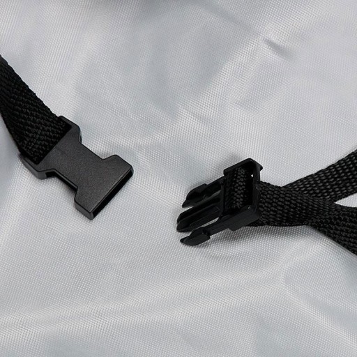 Na dole, na środku do pokrowca zostały przyszyte paski z klamrą do zapięcia pod motocyklem. Paski skutecznie utrzymują pokrowiec na swoim miejscu, minimalizując ryzyko zsunięcia się go, nawet podczas bardzo silnego wiatru.