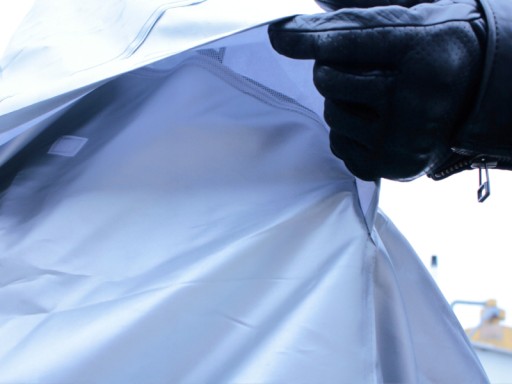 Na dole, na środku do pokrowca zostały przyszyte paski z klamrą do zapięcia pod motocyklem. Paski skutecznie utrzymują pokrowiec na swoim miejscu, minimalizując ryzyko zsunięcia się go, nawet podczas bardzo silnego wiatru.