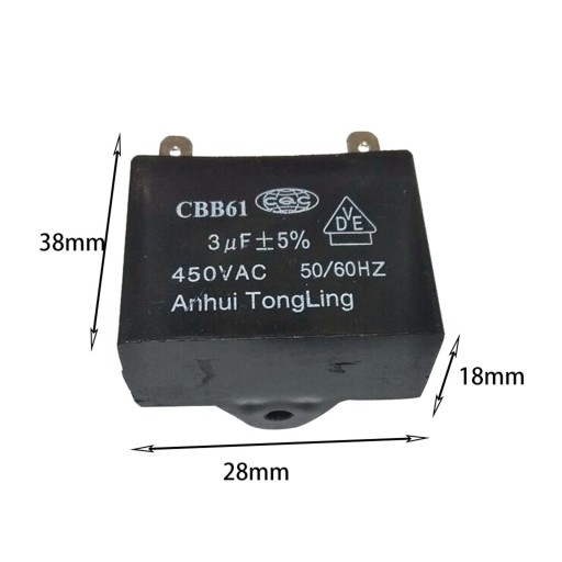 Specyfikacja: Pojemność znamionowa: ; Tolerancja: ±5%; Znamionowe: 450 V; Rozmiar okładki: 38x18x28mm /; Częstotliwość znamionowa: 50/60 Hz.