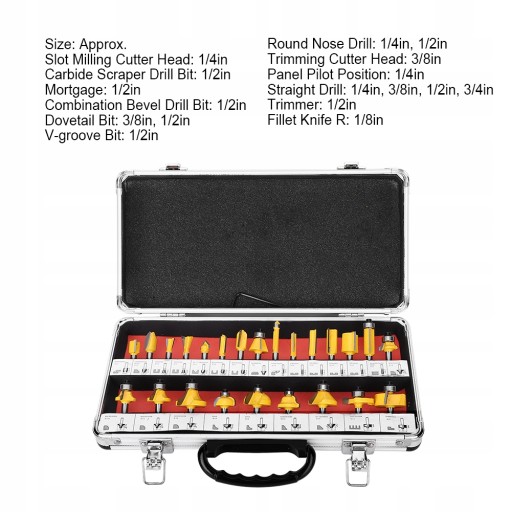 24 x głowica frezarska1 x wewnętrzny klucz sześciokątny1 x skrzynka aluminiowa