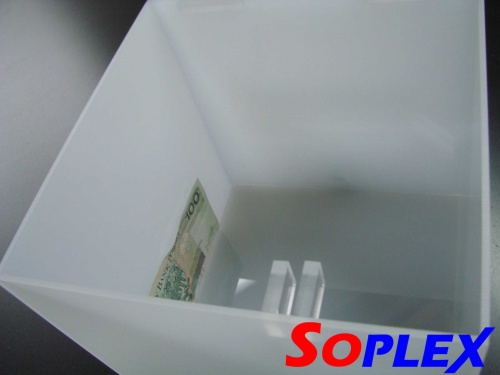 SKARBONKA z prześwitującej mlecznej plexi (pmma- polimetaktylan metylu) o grubości ścianki 3mm i wymiarach (szerokość, głębokość i wysokość):