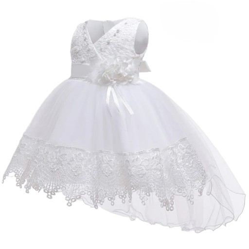 Biała, elegancka sukienka na szczególną okazję jaką jest chrzest dziecka. Wykonana z wysokiej jakości materiałów. Głównie z bawełny i części koronkowej. Z tyłu sukienki widoczny jest przepiękny tren. Sukienka jest bardzo elegancka, rozłożysta. Na samym przodzie znajdują się delikatne perełki oraz przypięty jest ozdobny kwiatek. Dostępna w rozmiarze na 6 miesięcy.