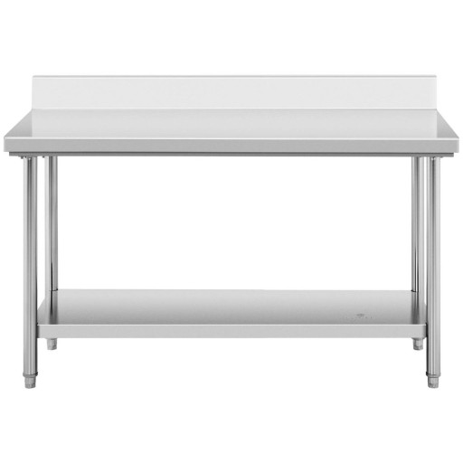 Stół roboczy marki Royal Catering jest przeznaczony do profesjonalnych kuchni. Sprawdzi się w kuchniach hoteli, restauracji, stołówek, w kantynach, pizzeriach oraz piekarniach a także w sklepach mięsnych i rybnych, szkołach, czy szpitalach. Wykonany został ze stali nierdzewnej, odpornej na rdzę, uszkodzenia mechaniczne oraz matowienie. Duży blat o wymiarze 150 x 60 cm oraz dodatkowa półka o wymiarze 147 x 47 cm zapewniają wystarczającą ilość miejsca do pracy i przechowywania przyborów kuchennych. Odległość między blatem a półką wynosi 60 cm. Rant o wysokości 12 cm i grubości 3,5 cm chroni ścianę przed zabrudzeniem. Nośność blatu wynosi 130 kg a dolnej półki 29 kg, łącznie 159 kg. Nóżki są regulowane, co czyni stół bardziej stabilnym nawet na nierównym podłożu.