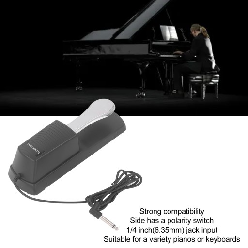 1. SILNA KOMPATYBILNOŚĆ: Z boku pedału znajduje się przełącznik polaryzacji z wejściem jack 1/4 cala (6,35 mm), odpowiedni dla różnych fortepianów i klawiatur