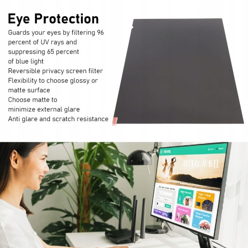 3. Ochrona oczu: Chroni oczy, filtrując 96 procent promieni UV i tłumiąc 65 procent niebieskiego światła. Jest to odwracalny filtr ekranowy, który zapewnia elastyczność wyboru pomiędzy powierzchniami błyszczącymi lub matowymi, a także wybór powierzchni matowych w celu ograniczenia odblasków zewnętrznych. Filtr jest odporny na odblaski i zarysowania!