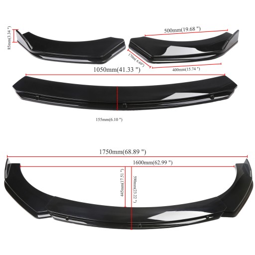 Uniwersalny splitter zderzaka przedniego w kolorze czarnym (połysk). Zestaw składa się z trzech części, które umożliwiają dopasowanie dokładki do samochodu.