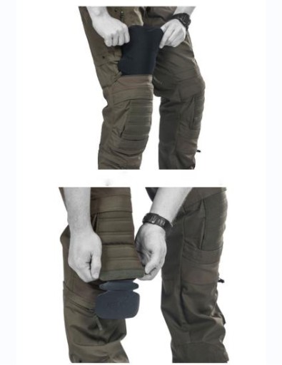 - Kieszeń na łydce ma wbudowany sznurek do wciągania nogawki, aby utrzymać nogawkę blisko buta i zapobiec przedostawaniu się obcych przedmiotów lub owadów do spodni.