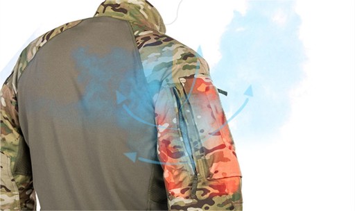 Podczas noszenia kamizelki bojowej lub noszenia w pełni załadowanego plecaka, wyjmowana wbudowana wyściółka AIR/PAC bardzo skutecznie rozkłada ciężar, zmniejsza nacisk i zapewnia komfort. W przypadku zamoczenia koszulki można wykorzystać efekt ciepła ciała i cyrkulacji powietrza do przyspieszenia schnięcia.