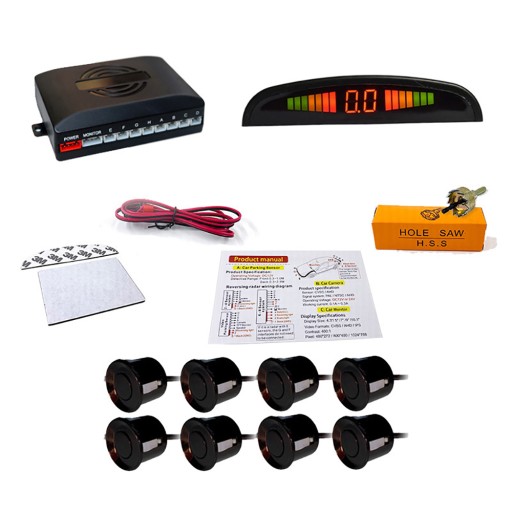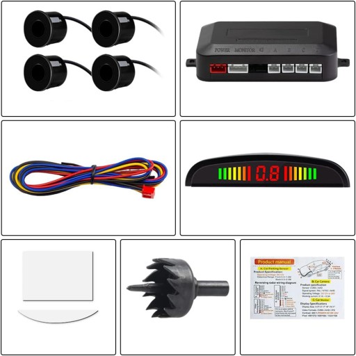 Opakowanie zawiera:Cztery czujniki ultradźwiękowe w kolorze srebrnymwyświetlacz z buzzeremCentralka sterującaNiezbędne okablowanie i akcesoriaWiertło z otwornicąInstrukcja obsługi i montażu w języku polskim