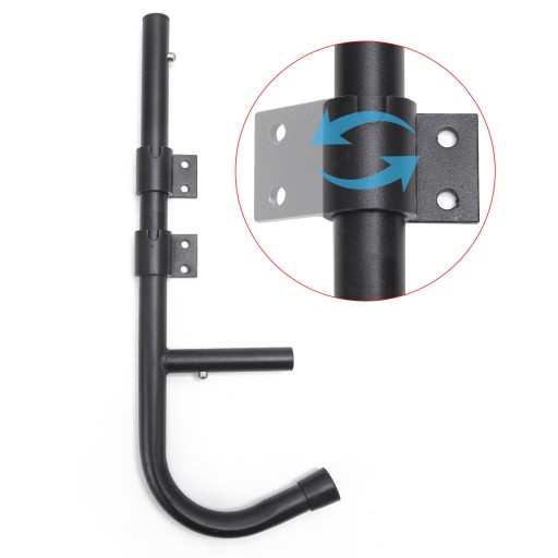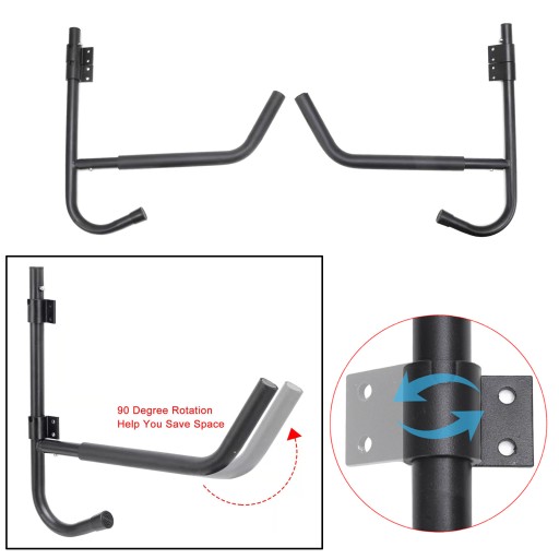 - Stojak do przechowywania kajaków można obracać w poziomie o 180 stopni. Gdy nie jest używany, można go złożyć do ściany, oszczędzając miejsce.