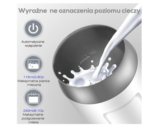 spieniacz do mleka posiada trzy tryby pracy. Spienić gorące mleko, podgrzewać mleko lub czekoladę, spieniać zimne mleko. Pojemność: 115 ml (do produkcji zimnej lub gorącej spienionej mleka), 240 ml (do podgrzewania mleka). Pianka zapewnia niesamowicie aksamitną i kremową idealną, trwałą piankę mleczną do latte, cappuccino, gorącej czekolady i kawy mrożonej.