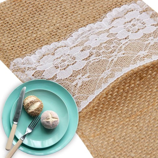 🍴 Juta z delikatnymi białymi koronkowymi kwiatami i wzorzystymi ozdobami doda nakryciu stołu odrobinę rustykalnej i elegancji w stylu retro.