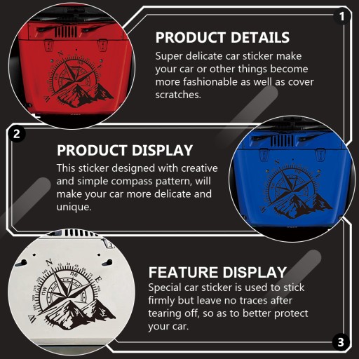 To kreatywna i wyjątkowa naklejka samochodowa, która sprawi, że Twój samochód będzie wyglądał jak nowy i zapewni Ci więcej zabawy. Wykonany jest z wodoodpornego materiału PVC, bezpiecznego, delikatnego i trwałego. Ma prostą metodę aplikacji, łatwą do wklejenia, wystarczy wycelować w odpowiednią pozycję samochodu. Kreatywny i niepowtarzalny wzór kompasu przyniesie ci więcej radości i dobrze ozdobi twój samochód.