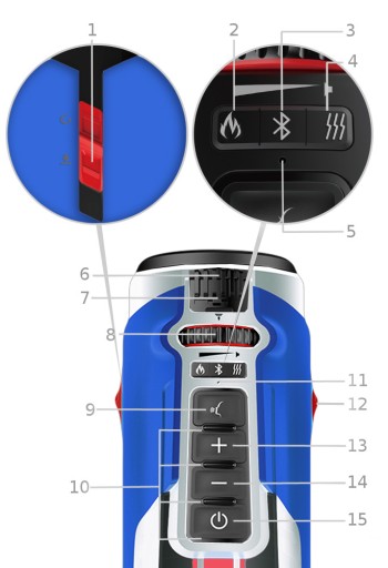 - #15 Przycisk ON/OFF uruchamianie/wyłączanie urządzenia. Aby uruchomić urządzenie należy wcisnąć i przytrzymać przycisk około 3 sekund. W trakcie użytkowania poprzez krótkie wciśnięcie przycisku ON/OFF urządzenie przechodzi w tryb pauzy, ponowne jego krótkie wciśnięcie aktywuje gadżet na nowo. Jeżeli pauza trwa dłużej jak 30 minut, urządzenie samoczynnie wyłączy się.