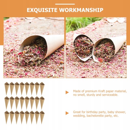 Te papierowe stożki są wykonane z najwyższej jakości materiału papierowego, łatwego do zrolowania i zrobienia stożka, który może pomieścić konfetti, mini bukiet, płatki, cukierki, czekoladki itp. Świetne do dekoracji ślubnych i imprezowych w stylu klasycznym lub vintage.