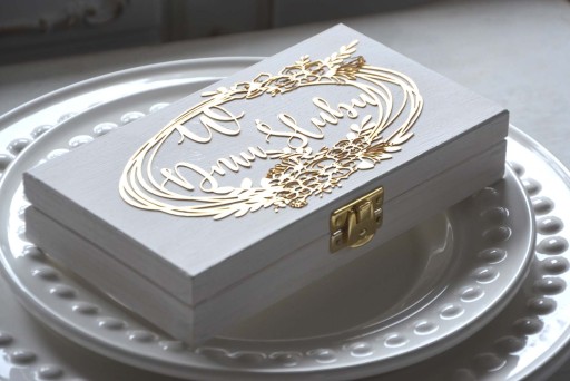 ✔️ Grawer z imionami młodej Pary i datą naniesiony na wieku pudełka białego lub zielonego,