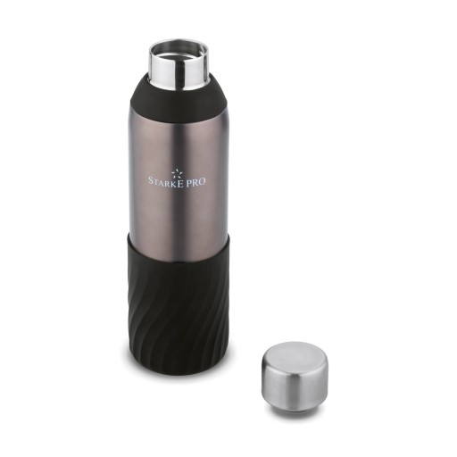 Jasnobrązowa butelka termiczna Starke Pro Hario 600 ml wykonana jest z trwałej stali nierdzewnej. Produkt jest szczelny i ma próżniową termoizolację z podwójnymi ściankami. Zabezpieczeniem przed rozlaniem zawartości – zimnych lub gorących napojów – jest poręczna zakrętka z uszczelką. Smukły kształt ułatwia schowanie butelki do plecaka lub innego bagażu podręcznego. Zapewni ci też wygodę gaszenia pragnienia w podróży. Produkt ma konstrukcję dobrze zabezpieczoną przed przypadkowym uszkodzeniem. To dobry pomysł na prezent dla osób uprawiających sport lub prowadzących aktywny tryb życia. Model wykończono silikonem, więc zapewnia bardzo dobry chwyt. Mając ją w dłoni, na pewno nie sparzysz się w rękę gorącą kawą.