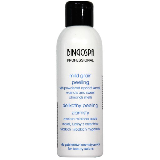 Produkt BINGOSPA Professional delikatny peeling ziarnisty przeznaczony jest dla kosmetyczek ze względu na wysoką zawartość składników aktywnych. Delikatny peeling ziarnisty z olejem z pestek moreli. Peeling złuszcza skórę przygotowując ją do zabiegów profesjonalnych. Produkt rekomendowany w czasie silnej ekspozycji na czynniki zewnętrzne (lato i zima). Sposób użycia: peeling nakładamy opuszkami palców na twarz, szyję i dekolt. Po nałożeniu należy wykonać delikatny masaż naskórka (ok. 2-3 minuty), aż do wchłonięcia części kremowej. Po tym czasie zmywamy produkt letnią wodą. Po zmyciu i osuszeniu skóry ewentualne pozostałe drobinki pestek moreli usuwamy suchą dłonią. Przy aplikacji omijać okolice oczu i ust. Nie stosować w przypadku uczulenia na którykolwiek ze składników.