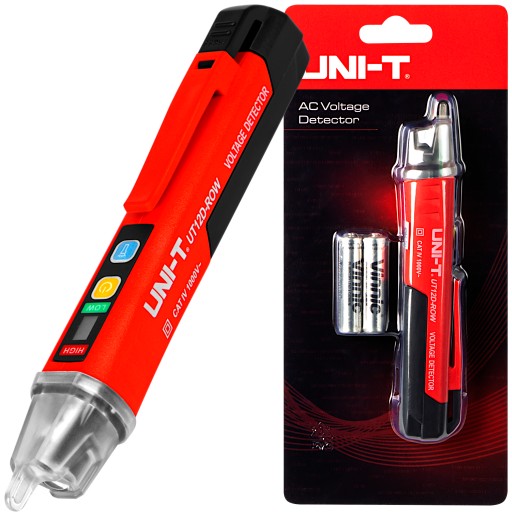 Detektor obecności napięcia znanej i cenionej marki UNI-T umożliwiający bezprzewodową detekcję napięcia zmiennego AC w zakresie 24-1000V AC sygnalizowanej dźwiękowo za pomocą wbudowanego buzzera oraz optycznie dzięki wbudowanej diodzie LED. Idealny do sprawdzania różnego rodzaju przewodów, zacisków czy przejściówek znajdujących się w zasięgu.