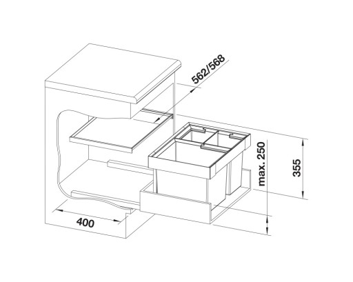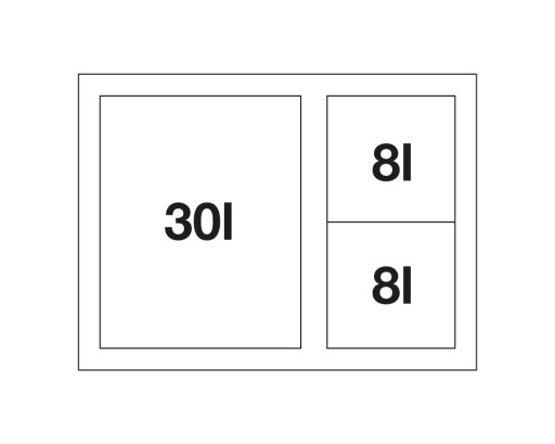 Wymagana jest szafka dolna z pokrywą i wysuwaną szufladą.• Wysokość montażowa 355 mm nad dnem szuflady, wysokość montażowa bez pokrywy systemowej 325 mm nad dnem szuflady, minimalna głębokość montażowa 400 mm.• Wymagane prowadnice 450 mm o pełnym wysuwie.• Maksymalna wysokość ramy 250 mm nad dnem szuflady.• Nadaje się również do montażu w szafkach dolnych z drzwiami ramowymi i panelowymi od 90 mm.• Podczas planowania należy zwrócić uwagę na wysokość montażową systemu segregacji odpadów, wysokość dna szuflady, głębokość montażową zlewozmywaka z armaturą przelewowo-odpływową i wynikające z tego minimalne wymiary szafki dolnej.• Minimalna zalecana wysokość cokołu do montażu MOVEX: 100 mm.BLANCO FLEXON II XL 60/3system do montażu w szufladach, pokrywa systemowa, 1 x kosz 30 l i 2 x kosz 8 l, 1 x pokrywa kosza 8 l