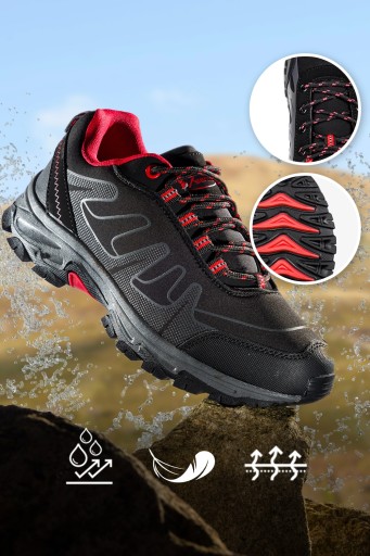 Czarne buty trekkingowe damskie model B2116-3 zostały wykonane z wysokogatunkowych materiałów co gwarantuje doskonałą jakość i dopasowanie do stopy. Obuwie typu softshell to lekkie, wygodne buty sportowe z nowoczesnych i trwałych materiałów. Niezastąpione na spacer, do biegania lub na wyprawy górskie. To obuwie idealne dla aktywnych kobiet, lubiących spędzać czas na łonie natury, jak również miłośniczek górskich wycieczek. Cholewka wykonana jest z oddychającego materiału softshell, który ma również właściwości wodoodporne. Wnętrze obuwia w okolicach pięty i kostki jest wypełnione miękką pianką, a podszewka z siatki poprawia wentylacje i higienę stóp. Gumowa trwała podeszwa jest lekka, elastyczna i antypoślizgowa wykończona żłobieniami dzięki temu buty są odporne na wszelkie nierówności powierzchni. Amortyzujące właściwości buta pomagają zachować stabilność, przyczepność oraz wysoki komfort podczas intensywnego użytkowania. Zaokrąglony czubek butów zapewnia dodatkową ochronę dla palców, minimalizując ryzyko kontuzji podczas przemierzania trudnego terenu. To rozwiązanie szczególnie docenią osoby, które często wędrują po kamienistych szlakach. Sznurowane zapięcie pozwala na idealne dopasowanie buta do stopy, co zwiększa komfort noszenia i stabilność. Sznurowadła są wytrzymałe i odporne na przetarcia, co zapewnia długotrwałe użytkowanie. Wygodne i stabilne buty trekkingowe są niezbędne, aby cieszyć się w pełni każdą wyprawą na łono natury. Świetnie sprawdzą się podczas górskich wypraw jak i leśnych wędrówek. Posiadają niską cholewkę przed kostkę. Czerwone dodatki to idealny sposób, aby dodać obuwiu subtelności i szczypty uroku. Wytrzymała konstrukcja czyni ten model butem wielosezonowym, sprawdzającym się o każdej porze roku.