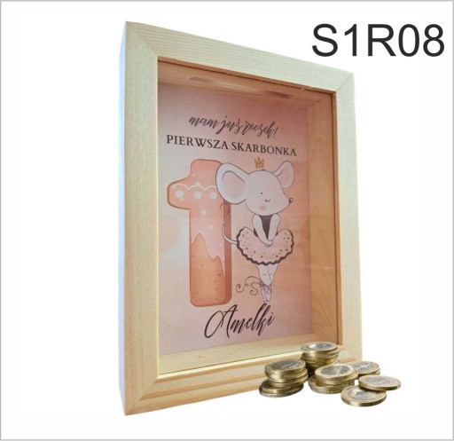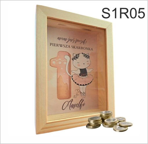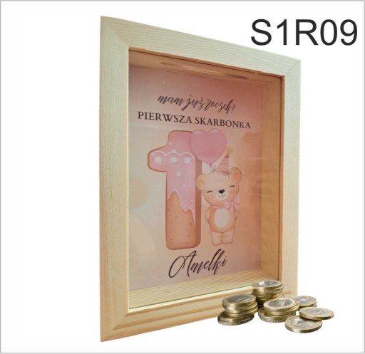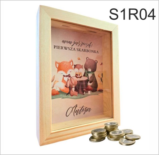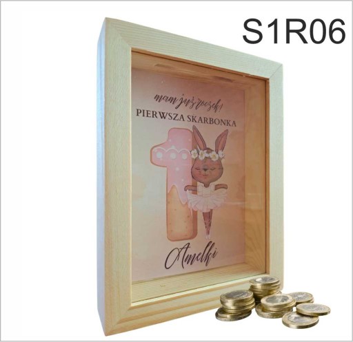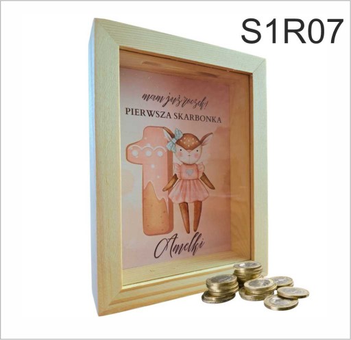 Skarbonka wykonana została z drewna a jej tylnia ściana ozdobiona została nadrukiem z imieniem dziecka. Przód skarbonki wykonany został z przeźroczystej szyby.