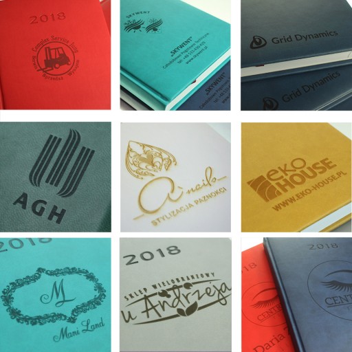 Bardzo dobrej jakości kalendarze drukowane i składane w Polsce, w oprawie typu Vivella. Format A5 (14,5 x 20,5 cm), 360 stron, układ dzienny (sobota i niedziela na jednej stronie), barwna i miękka okładka, indywidualny grawer tworzony na podstawie przesłanego pliku graficznego - wektorowego tzw. krzywe (przykładowy format zapisu: .eps, .ai, .cdr, .svg, .pdf).
