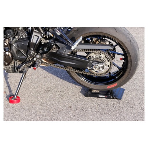 Wykonane z aluminium rolki pomagające w pielęgnacji łańcucha i obręczy. Wyjątkowo płaska, lekka i łatwa w obsłudze konstrukcja. Tylne koło można łatwo obracać ręcznie, a gumowane powierzchnie styku zapobiegają ślizganiu się pomocy do obracania. W zestawie podkładka dystansowa do podpórki bocznej i pasek zabezpieczający do blokowania dźwigni hamulca.