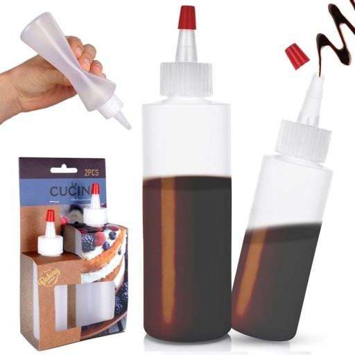Zestaw dwóch eleganckich butelek, idealnych do dekoracji ciast lub dozowania sosów. Butelki posiadają praktyczne zatyczki, które zapewniają łatwe i precyzyjne dozowanie zawartości. Dodatkowo, miękkie ścianki butelek ułatwiają wyciskanie sosów lub innych płynnych składników. Dzięki temu zestawowi, każde danie będzie wyglądało jeszcze bardziej apetycznie, a dozowanie sosów stanie się prostsze i bardziej precyzyjne.