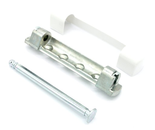Opis: zawias wykonany jest z metalu ocynkowanego. Jest to zawias okienny górny. Zawias przykręcany jest do ramy okna za pomocą 4 wkrętów. Posiada estetyczną nakładkę z tworzywa w kolorze białym. Zawias tego typu jest stosowany najczęściej w oknach PVC. Jest to zawias uniwersalny bez odmian. Maksymalna waga skrzydła to 100 kg.