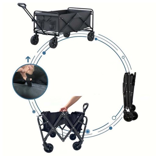 Składany wózek o solidnej konstrukcji stalowej, wodoodporny materiał 600D, 2 uchwyty na kubki, przechowywanie przedmiotów, maksymalne obciążenie może osiągnąć 150 kg, nie wymaga instalacji, łatwy do otwarcia i złożenia, zajmuje mało miejsca, nadaje się do aktywności na świeżym powietrzu, takich jak zakupy, plaża, kemping. Wierzę, że będzie dobrym towarzyszem w Twojej rodzinie!