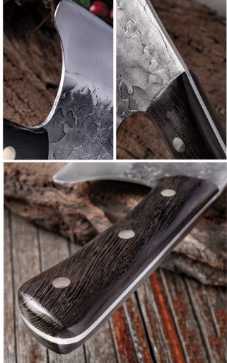Profesjonalny i poręczny nóż wykonany z wysokiej jakości, ręcznie kutej twardej stali nierdzewnej oraz wyselekcjonowanego drewna. Dodatkowo rączka posiada estetyczne, drobne zdobienia.