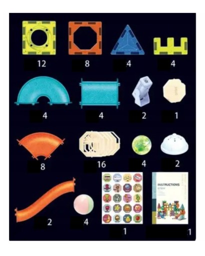 W zestawie znajdują się płaskie panele, tuby, kulki oraz naklejki. Podświetlane kolorowe kulki i świecące jasnym światłem reflektorki urozmaicają zabawę tworząc efekt świecącego toru.