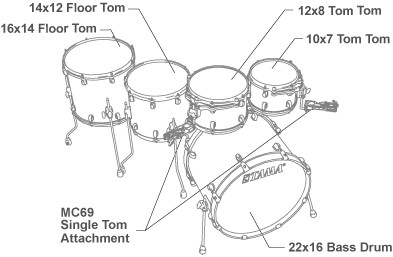 W zestawie znajduje się bęben basowy o wymiarach 22x16 cali, który nie posiada otworu na tom holder, dwa tomy o wymiarach 10x7 i 12x8 cali oraz dwa floor tomy w rozmiarach 14x12 i 16x14 cali. Do zestawu dołączono dwa uchwyty na tomy Tama MC69, co pozwala na elastyczne ustawienie konfiguracji.