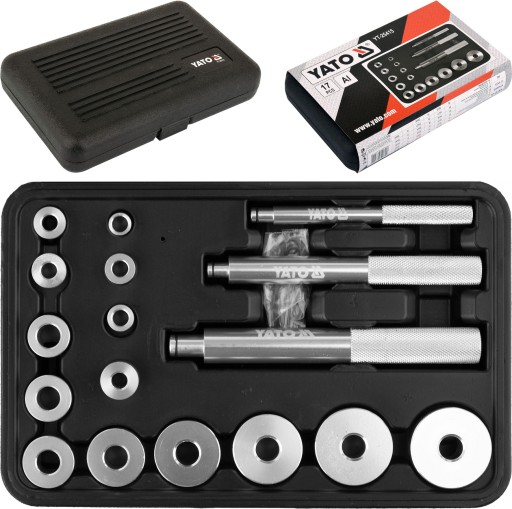Dane techniczne:Symbol: YT-25415Seria: GRDMateriał: aluminium 6066Zastosowanie: do osadzania łożysk i uszczelniaczyZawartość zestawu: trzpień x3 (O11x115 mm, O16x140 mm, O21x160 mm)|adaptor x14 (O10x12, O12x14, O14x16, O15x17, O16x18, O18x20, O20x22, O22x24, O25x27, O28x30, O30x34, O32x36, O35x40, O38x42 mm)Liczba sztuk w zestawie: 17Zestaw stosowany do równoosiowego montażu łożysk, pierścieni, uszczelniaczy, tulei i wałków tocznych Pasuje do większości modeli samochodów osobowych.Zestaw zawiera:3 sztuki trzpieni: O 11x115 mm, 16x140 mm, 21x160 mm14 sztuk adaptorów o rożnych średnicach: 10/12, 12/14, 14/16, 15/17, 16/18, 18/20, 20/22, 22/24, 25/27, 28/30, 30/34, 32/36, 35/40, 38/42 mmMateriał: aluminium 6066.**