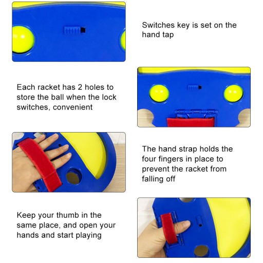 - Produkt skada się z dwóch rakiet, czterech piek. Trzymaj rakietę prawą ręką, poluzuj wszystkie zapięcia i wóż kciuk w pierścień maego palca, a pozostae cztery palce w pierścień dużego palca. Przekręć przeączniki rakiety w lewo i otwórz je w pozycji NO. Usuń pikę. Umieść jedną z piek w „twarzy rakiety”. Zamknij rakietę. Pika rakietowa szybko się odbija, umożliwiając partnerowi zapanie jej rakietą po drugiej stronie i podanie w ten sam sposób.