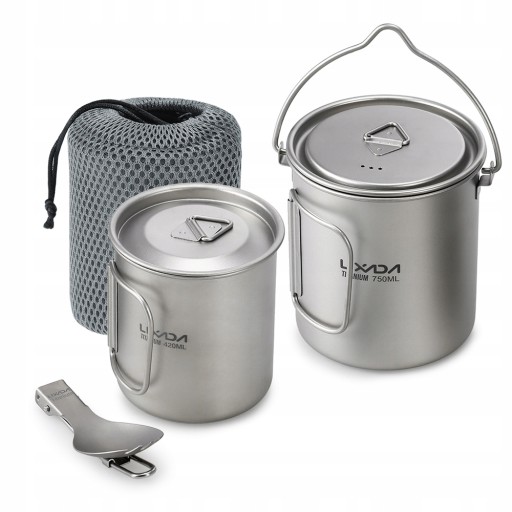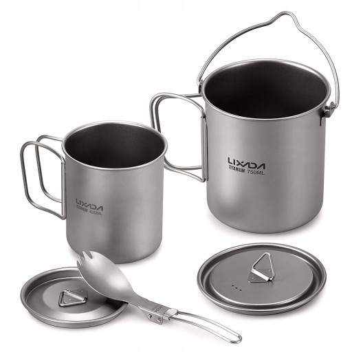 Zestaw 3 części: W pełni tytanowy zestaw zawiera dzbanek o pojemności 750 ml, kubek 420 ml i składaną łyżkę, idealny na kemping, wędrówki, wędrówki z plecakiem, przygody na świeżym powietrzu i przetrwanie.