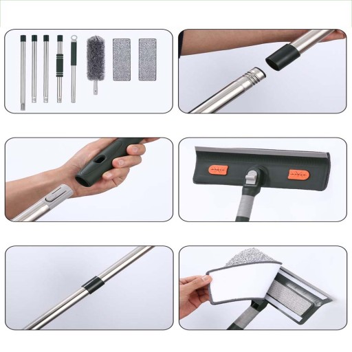 【Bardzo długie pręty łączące】Profesjonalny środek do czyszczenia okien jest wyposażony w 5 prętów łączących ze stali nierdzewnej z uchwytami, które można wydłużyć do 210 cm, co pozwala na regulację wysokości skrobaczki do okien i szczotki do kurzu w razie potrzeby, nadaje się do ochrony talii i pleców. Idealny do czyszczenia i odkurzania wysokich okien, nie wymaga drabiny ani narzędzi.