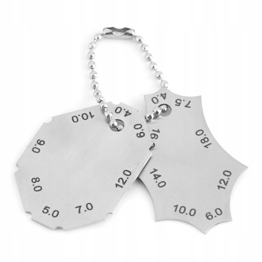 Dane techniczne: Materiał: Stal nierdzewna Wskaźnik gardła: 4,0, 5,0, 6,0, 7,0, 8,0, 9,0, 10,0, 12,0 (mm) Rozstaw nóg: 4,0, 6,0, 7,5, 10,0, 12,0, 14,0, 16,0, 18,0 (mm) Paczka zawiera: 1 x dwuczęściowy przyrząd spawalniczy