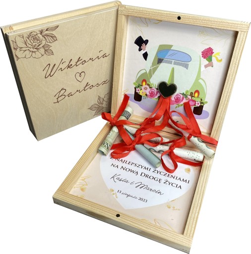 Nasze pudełko to wspaniały sposób, by wręczyć Parze Młodej prezent w formie gotówki w elegancki sposób, a dodatkowo będzie to stanowiło pamiątkę na lata. W środku znajdują się życzenia na nową drogę życia. Na wieczku znajduje się wysokiej jakości grawer wraz z imionami Pary Młodej.
