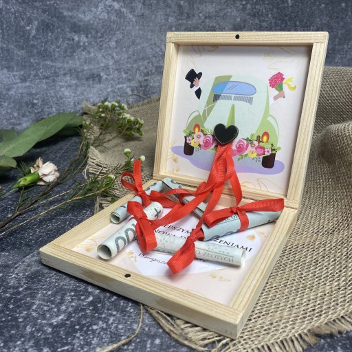 Drewniane pudełko na pieniądze z wysokiej jakości nadrukiem z okazji Ślubu
